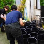 市場から仕入れた切り花は、すべて箱から取り出して水揚げと呼ばれる作業を行います。これは花に新鮮な水分を供給するのに、とても重要な行程です。そして、花政の花の特徴の一つである「花持ちの良さ」は、この処理に秘密が隠されています。と言っても、それは一つひとつの作業を、丁寧に、迅速に処理する事がなにより大切な心構えです。そして、この処理の善し悪しが、開花の具合や花持ちに大きく影響します。